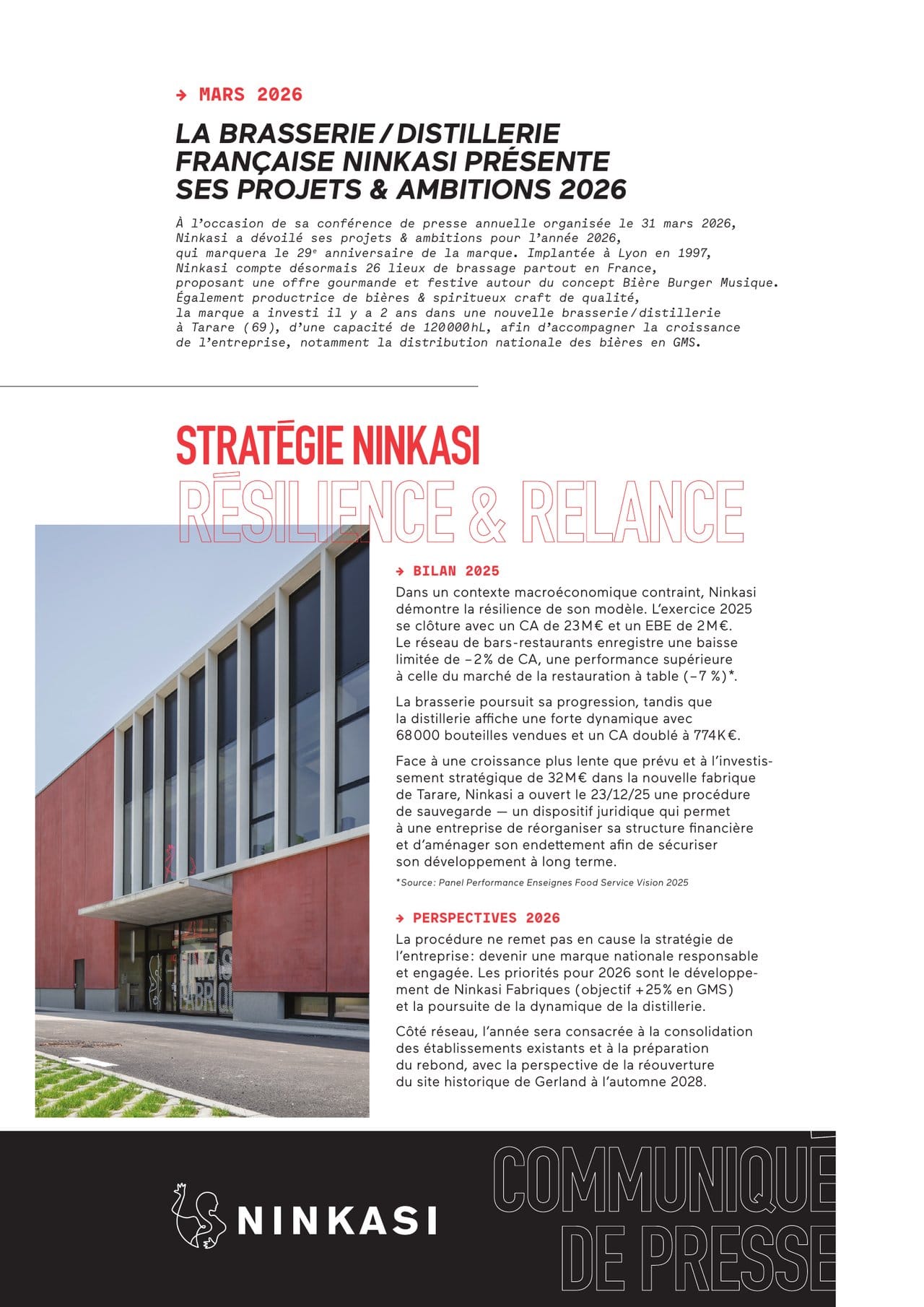 Face à une croissance plus lente que prévu et à l'investissement stratégique de 32 M € dans la nouvelle fabrique de Tarare, Ninkasi a ouvert le 23/12/25 une procédure de sauvegarde — un dispositif juridique qui permet à une entreprise de réorganiser sa structure financière et d'aménager son endettement afin de sécuriser son développement à long terme.